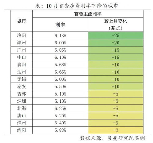 20日,貝殼研究院發(fā)布數(shù)據(jù)稱,10月份,貝殼研究院監(jiān)測(cè)的90城主流首套房貸利率為5.73%,二套利率為5.99%,均較上月下調(diào)1個(gè)基點(diǎn)。