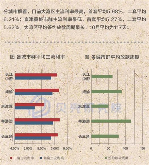 分城市群看,目前大灣區(qū)主流利率最高,首套平均5.98%,二套平均6.21%;京津冀城市群主流利率最低,首套平均5.27%,二套平均5.62%。大灣區(qū)平均簽約放寬周期最長(zhǎng),10月平均為117天。