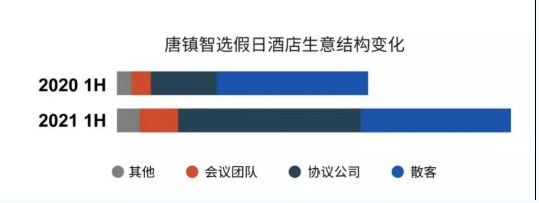 在生意結(jié)構(gòu)從原本散客為主調(diào)整成協(xié)議公司份額占多數(shù)后,上海唐鎮(zhèn)智選假日酒店ADR開始大幅攀升,RevPAR在2020年半年時(shí)間內(nèi)翻了一番,更是在今年7月創(chuàng)開業(yè)以來(lái)歷史新高,超過400元,7月平均入住率高達(dá)92%。2021年上半年,IHG貢獻(xiàn)率占客房收入高達(dá) 55%。