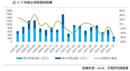 貝殼研究院統(tǒng)計顯示,今年1-10月房企境內(nèi)外債券融資累計約7993億元,較2020年同期下降24%,金額規(guī)模減少2463億元;其中境外發(fā)債折合人民幣約2471億元,同比下降約37.4%。境外融資規(guī)模占比維持31%左右的低水平。