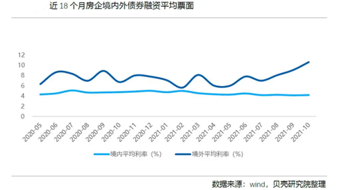 事實上,房企境外債利率已經(jīng)連續(xù)三個月維持大幅增長。貝殼研究院數(shù)據(jù)顯示,10月房企境外債券利率均值突破10%的高點,達(dá)到10.65%,較9月大幅上升157個基點。