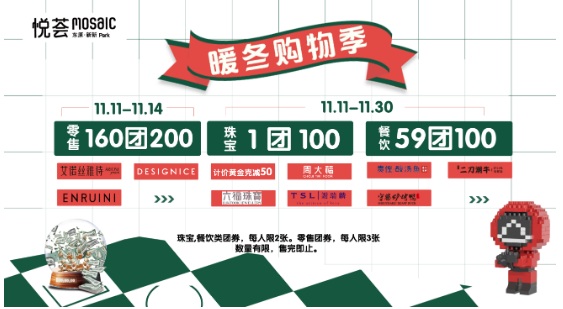 不止于此,東原·悅薈·新新Park還聯(lián)合場內(nèi)多家餐飲、零售、珠寶等品牌一同開啟購物狂歡節(jié)的超級禮遇。餐飲59團100、零售160團200、珠寶1團100、計價黃金克減50元等一系列折扣,為消費者帶來無限驚喜與特惠體驗,有效連接了品牌與消費者的粘合度。