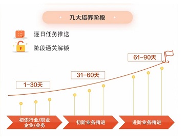 “星途計劃”90天的培訓成長體系分為9個階段。每個階段的知識點以“日常任務”的形式推送給個人。這些任務的編排不僅逐級遞進,而且剛好滿足一線員工當時的需求。