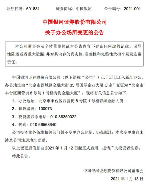 房訊網(wǎng)訊 1月13日,中國銀河證券股份有限公司發(fā)布公告稱,公司已于近日遷入新址辦公,辦公地址由“北京市西城區(qū)金融大街 35 號國際企業(yè)大廈 C 座”變更為“北京市豐臺區(qū)西營街8號院1號樓青海金融大廈。