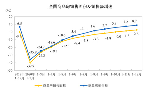 2020年,商品房銷售面積176086萬平方米,比上年增長2.6%,增速比1—11月份提高1.3個(gè)百分點(diǎn),上年為下降0.1%。其中,住宅銷售面積增長3.2%,辦公樓銷售面積下降10.4%,商業(yè)營業(yè)用房銷售面積下降8.7%。商品房銷售額173613億元,增長8.7%,增速比1—11月份提高1.5個(gè)百分點(diǎn),比上年提高2.2個(gè)百分點(diǎn)。其中,住宅銷售額增長10.8%,辦公樓銷售額下降5.3%,商業(yè)營業(yè)用房銷售額下降11.2%。