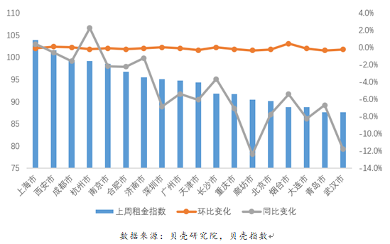 貝殼平臺(tái)重點(diǎn)18城上周租金指數(shù)環(huán)比和同比走勢(shì)