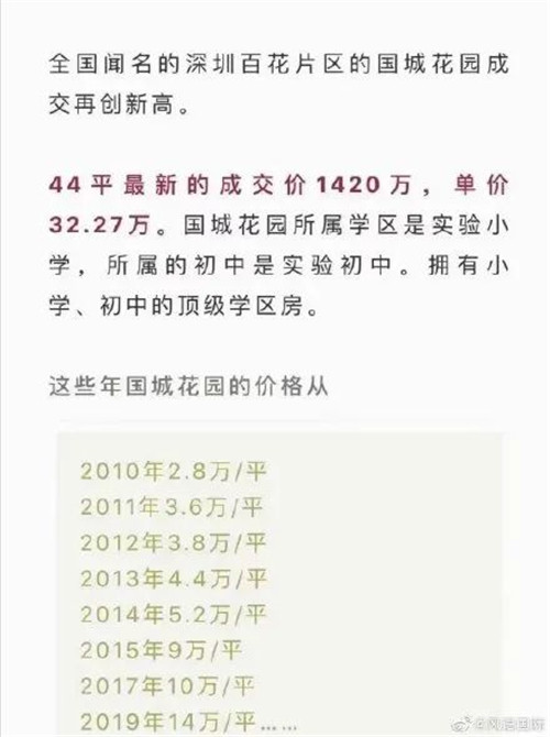 上周末,《證券時(shí)報(bào)》報(bào)道稱,有消息稱深圳福田百花片區(qū)的國(guó)城花園,44平方米房源成交價(jià)格達(dá)到1420萬元,折合每平方米32.27萬元。由于該小區(qū)自帶深圳實(shí)驗(yàn)小學(xué)和實(shí)驗(yàn)中學(xué)兩個(gè)優(yōu)質(zhì)學(xué)位,多年來,備受家長(zhǎng)和投資客追捧。鏈家APP顯示,該小區(qū)建成年代1995至1998年,樓齡已超過20年。該消息引爆全國(guó)人民的熱議。有網(wǎng)友表示,在幾年前,有人預(yù)言,深圳灣的房?jī)r(jià)將在幾年內(nèi)漲到三十萬一平,當(dāng)時(shí),大部分人都是不相信的,但現(xiàn)在,不僅深圳灣漲到了三十萬一平米,就連老破舊也漲到了三十多萬一平米。