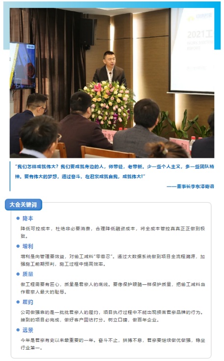 最后,會議號召,2021年,全體君豪人要緊扣公司戰(zhàn)略方向,以年度目標(biāo)為行動的燈塔,以“精質(zhì)量·節(jié)成本·增效益”為具體方針,深耕業(yè)務(wù),強(qiáng)練內(nèi)功,繼續(xù)在行業(yè)中做強(qiáng)做優(yōu),努力實現(xiàn)更高質(zhì)量、更有效率、更加健康的發(fā)展!