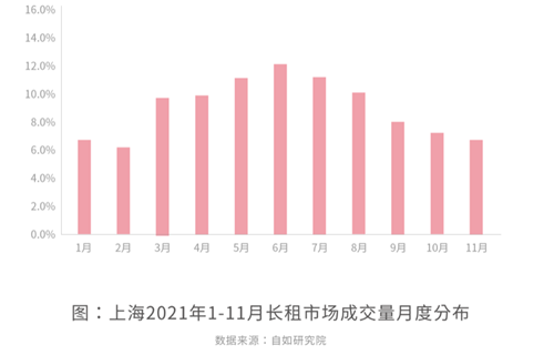 成交量的時間分布顯示,2021年上海長租市場淡旺季明顯。上半年呈“低開高走”的態(tài)勢,成交量自年初淡季后一路攀升。其中,3月白領(lǐng)季成交量環(huán)比上升58%,為全年增長最快的月份,而6月畢業(yè)季則成為全年成交量高峰。行至下半年,長租市場成交量略有收縮,但整體仍保持在較高水平。
