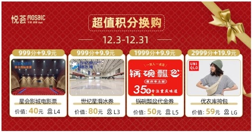 此次積分兌禮還推出了用積分加現(xiàn)金換購禮品的形式,用積分抵扣以后,僅需9.9元就可以兌換星會影城電影票、世紀星滑冰券、優(yōu)衣庫挎包等禮品,積分換購活動一經(jīng)推出就大受歡迎,將12月積分兌禮活動推向了高潮,給消費者帶來全新的驚喜換購和優(yōu)惠體驗。