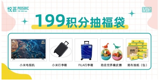 除此之外,更讓人驚喜的還有199積分抽取幸運福袋,百分之百中獎,小米電視、FILA行李箱、餐飲代金券、優(yōu)衣庫挎包等超多好禮,給各位會員帶來更多驚喜,也在歡樂購物之余平添了一絲神秘的色彩。