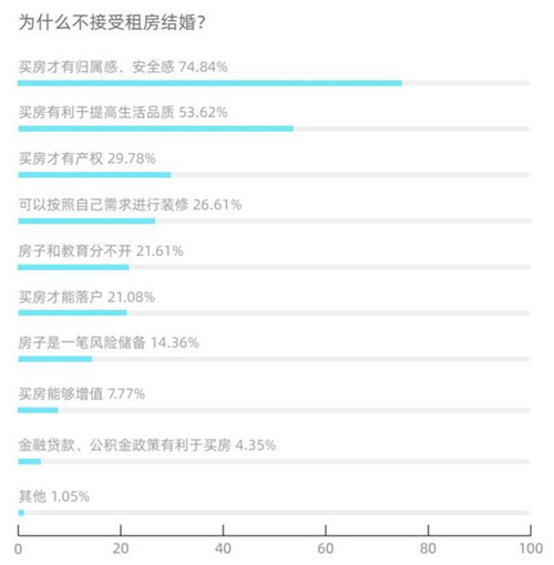 《報告》顯示,不支持租房結(jié)婚的受訪者里,75%的人認為,買房才有歸屬感、安全感,且超半數(shù)人認可“買房后有利于提高生活品質(zhì)”這一觀點。不再頻繁搬家、隨意地裝修布置、孩子和熟悉的朋友玩耍,這或許就是穩(wěn)定居所帶來的平凡但美滿的生活。