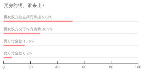 調(diào)研中,51%的受訪者表示,買房資金由男女雙方獨立、共同承擔,其次,30%的人表示部分資金源于雙方父母資助。同時,大多數(shù)人認為房子是共同財產(chǎn),“不管誰出錢,房產(chǎn)證上都要寫上夫妻雙方的姓名”,這一選項占比最高達到55%左右?梢,過去在婚姻中“男尊女卑”的觀念在減少,取而代之的是自由平等的關(guān)系。