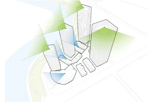 相較普通建筑群的整齊排列,項(xiàng)目設(shè)計(jì)的建筑群,肉眼可見(jiàn)每一棟都有不同角度的偏轉(zhuǎn),即交相輝映,又互不干擾,從而實(shí)現(xiàn)了各自獨(dú)立的觀景視野區(qū)。