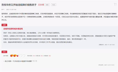 12月6日,澎湃新聞在人民網領導留言板看到,有網友反映,“山西省運城市吾悅華府今年國慶期間違規(guī)銷售工抵房……現在又開始違規(guī)降價銷售房子,成交均價在6500元左右的房子又一次降到5500元左右銷售!