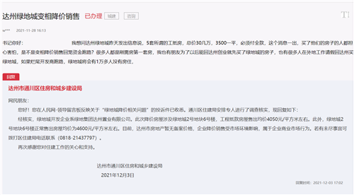 對此,達州市通川區(qū)住房和城鄉(xiāng)建設局12月3日回復表示,經核實,綠地城開發(fā)企業(yè)系綠地集團達州置業(yè)有限公司。此次降價房屋涉及綠地城2號地塊6號樓,工程抵款房屋售出均價4050元/平方米左右。此外,綠地城2號地塊6號樓正常售出房屋均價為4600元/平方米左右。目前,達州市房地產暫無備案價格,企業(yè)降價銷售受市場環(huán)境影響,屬于企業(yè)商業(yè)市場行為。