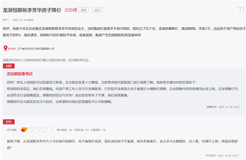 遼寧省沈陽市沈北新區(qū)區(qū)委書記11月16日回復稱,區(qū)委非常重視,立即責成相關職能部門進行調查了解。經房產局工作人員與開發(fā)商聯(lián)系,已告知開發(fā)商禁止低于備案價大幅降價銷售,企業(yè)銷售中的特殊情況必須上報。企業(yè)銷售行為,必須符合行業(yè)銷售規(guī)定。