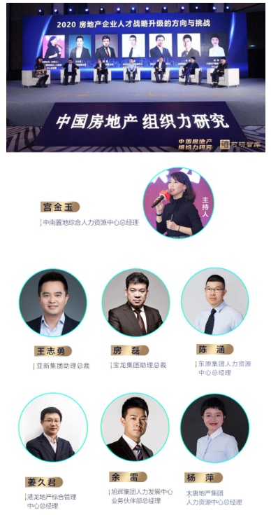 在中南置地綜合人力資源中心總經(jīng)理宮金玉主持下,亞新集團助理總裁王志勇、寶龍集團助理總裁房磊、東原集團人力資源中心總經(jīng)理陳涵、港龍地產(chǎn)綜合管理中心總經(jīng)理姜久君、旭輝集團人力發(fā)展中心業(yè)務(wù)伙伴部總經(jīng)理余雷、大唐地產(chǎn)集團人力資源中心總經(jīng)理楊萍以“2020 房地產(chǎn)企業(yè)人才戰(zhàn)略升級的方向與挑戰(zhàn)”為議題進行了第二場圓桌論壇。