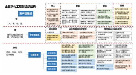 以智云機(jī)房為依托的S集團(tuán)全數(shù)字化工程物業(yè)組織,針對(duì)工程物業(yè)組織日常管理的“人、事、物、錢”等各種具體事項(xiàng),拆分成能耗管理、設(shè)備運(yùn)行、環(huán)境管理、人員管理、維修管理、巡檢維保管理、設(shè)備安全、資產(chǎn)管理8個(gè)領(lǐng)域,分成資產(chǎn)管理組、中控管理組與技術(shù)管理組三個(gè)模塊,推進(jìn)日常管理。