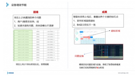 間接價(jià)值主要是服務(wù)品質(zhì)的提升,而直接價(jià)值包括人力、財(cái)力兩方面的節(jié)約。從6個(gè)月的運(yùn)營(yíng)數(shù)據(jù)來(lái)看,十萬(wàn)量級(jí)成本節(jié)約可以輕松取得。人力方面,以14名技工編制的場(chǎng)館對(duì)標(biāo)(含冷站),目前冷站運(yùn)行至少釋放2個(gè)人力,能耗管理釋放0.5個(gè)人力,環(huán)境管理及排障釋放1個(gè)人力,在提升管理效率、實(shí)現(xiàn)真巡檢、真維保的同時(shí),大約釋放了3-4人的人力,去年忙不過(guò)來(lái)業(yè)務(wù),現(xiàn)在輕松就可以完成。