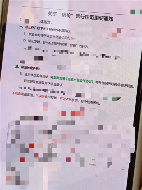 記者發(fā)現(xiàn),有中介機(jī)構(gòu)已經(jīng)內(nèi)部要求從業(yè)人員“禁止參與任何業(yè)主抱團(tuán)漲價(jià)的行為;業(yè)主修改放盤價(jià)格,需重新簽訂《房屋出售委托協(xié)議》”。