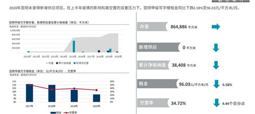 在“2020年昆明房地產(chǎn)市場(chǎng)回顧報(bào)告”中,昆明甲級(jí)寫字樓市場(chǎng)無新增供應(yīng),全市存量維持在864886平方米。一方面,在高空置和疫情的雙重影響下,業(yè)主為提升入住率,采取以價(jià)換量措施導(dǎo)致昆明甲級(jí)寫字樓租金在2020年同比下滑6.58%至96.03元平方米月。另一方,租金的下滑為非甲級(jí)寫字樓租戶提升辦公品質(zhì)提供了契機(jī),租戶置換辦公空間需求明顯提升,推動(dòng)全市空置率同比下降。