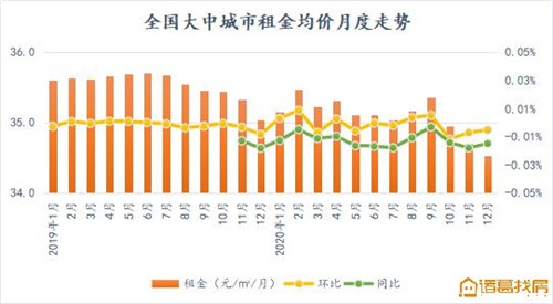 據(jù)諸葛找房數(shù)據(jù)研究中心監(jiān)測(cè)數(shù)據(jù),2020年12月,全國(guó)大中城市租金掛牌均價(jià)為34.53元/平方米/月,環(huán)比下降0.5%,同比下降1.47%,環(huán)比降幅較上月收窄0.2個(gè)百分點(diǎn)。全國(guó)大中城市租金均價(jià)波動(dòng)下滑,10月份以來(lái)租賃市場(chǎng)進(jìn)入傳統(tǒng)的行業(yè)淡季,疊加疫情的影響尚未完全消散,租賃市場(chǎng)持續(xù)低溫表現(xiàn),12月租金下滑至兩年內(nèi)最低水平。