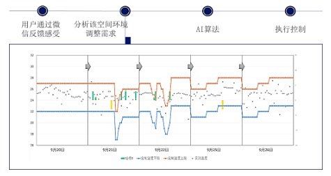 下圖為某多人辦公室在運(yùn)行一周后的調(diào)節(jié)情況,其中紅、藍(lán)色線條圈出的是房間需求溫度,柱狀圖表示用戶的反饋。可以看到,經(jīng)過一周的調(diào)節(jié),房間會(huì)逐漸學(xué)習(xí)到穩(wěn)定的用戶偏好。