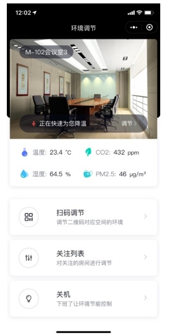 各反饋端口均考慮實(shí)際使用需求,采用人性化設(shè)計(jì)。以APP操作為例,頁面上方顯示當(dāng)前環(huán)境的各項(xiàng)監(jiān)測參數(shù),均為實(shí)時(shí)數(shù)據(jù),客戶可在下方操作區(qū)選擇當(dāng)前的感受;底部關(guān)閉按鈕,可在客戶提前下班或其他原因離開房間時(shí)使用,系統(tǒng)會(huì)進(jìn)入節(jié)能模式,如需臨時(shí)重啟,隨時(shí)反饋冷、熱即可;夜間或周末如需使用空調(diào),在界面操作即可開啟,非工作時(shí)間默認(rèn)用戶啟動(dòng)3小時(shí)加班空調(diào),如需延長,再次操作界面即可。