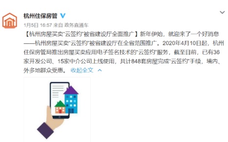 2020年4月10日起,杭州市住保房管局正式推出房屋買賣應(yīng)用電子簽名技術(shù)的“云簽約”服務(wù),實(shí)現(xiàn)全程網(wǎng)辦和“不見面簽約”,交易當(dāng)事人可通過(guò)手機(jī)端遠(yuǎn)程進(jìn)行身份認(rèn)證、條款協(xié)商、電子簽名確認(rèn)簽約等,打破時(shí)間、空間限制,解決群眾至房地產(chǎn)開發(fā)企業(yè)、中介企業(yè)簽約現(xiàn)場(chǎng)簽約的“最后一公里”問題。