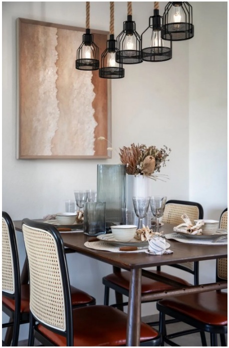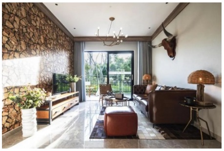 復(fù)古的質(zhì)感在客廳彌漫。西部天然的石拱,巨大的峽谷,迷人的溝穴,風(fēng)化而成的奇形崖壁匯成一種標(biāo)示,經(jīng)過(guò)數(shù)百萬(wàn)年時(shí)間侵蝕的柔軟砂巖點(diǎn)綴在客廳,野奢的風(fēng)格色彩鮮明,仿若置身曠野的非洲大陸。