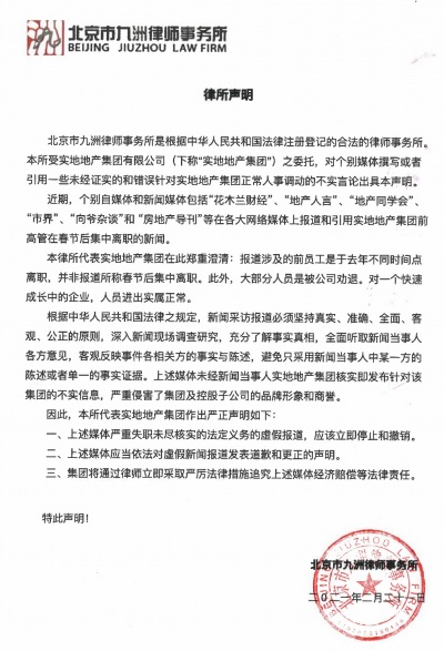 實地集團通過北京九洲律師事務所發(fā)布的這份律所聲明顯示,“花木蘭財經”等自媒體未與當事人實地地產集團核實即發(fā)布相關信息,“嚴重侵害了集團及控股子公司的品牌形象和商譽”。為此,聲明要求上述自媒體立即停止和撤銷相關報道,并進行更正和公開道歉。