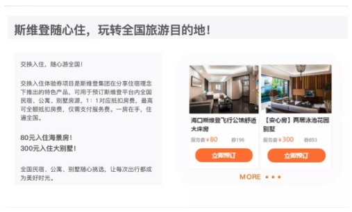 反觀斯維登,利用業(yè)主房間的空置期,將房間放入斯維登全國交換池,業(yè)主獲得體驗券,任選斯維登全國房源入住,僅需支付基礎(chǔ)服務(wù)費;幾千的別墅幾百住,幾百的公寓百元住。并且其體驗券發(fā)放數(shù)額根據(jù)業(yè)主空置天數(shù)來計算,不影響房源出租的正常收益。覆蓋全國280+目的地的房源規(guī)模,足以給到合作業(yè)主超值驚喜,讓業(yè)主享受高品質(zhì)的旅居體驗。