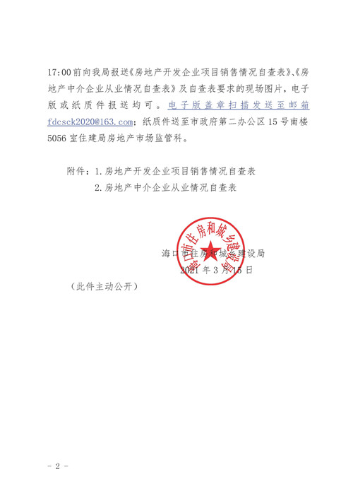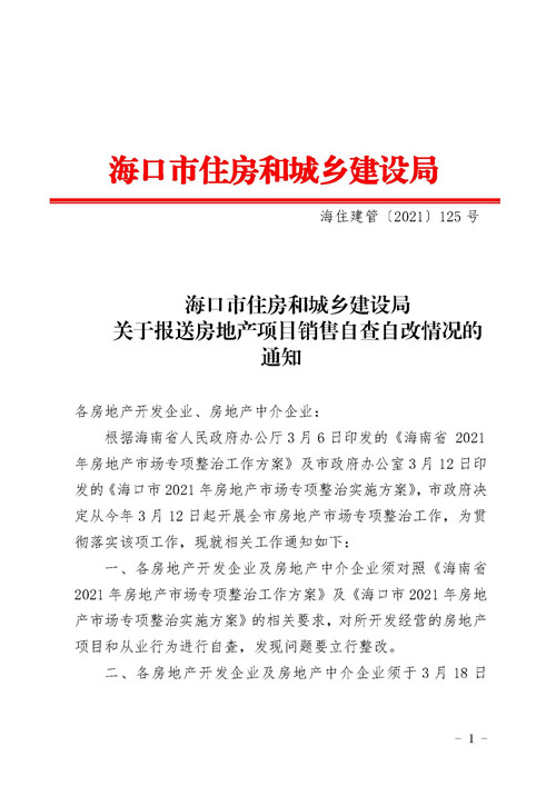 房訊網(wǎng)訊 3月15日,?谑凶》亢统青l(xiāng)住建局發(fā)布《關(guān)于報(bào)送房地產(chǎn)項(xiàng)目銷售自查自改情況的通知》,貫徹《海南省2021年房地產(chǎn)市場(chǎng)專項(xiàng)整治工作方案》及《?谑2021年房地產(chǎn)市場(chǎng)專項(xiàng)整治實(shí)施方案》,開(kāi)展全市房地產(chǎn)市場(chǎng)專項(xiàng)整治工作。