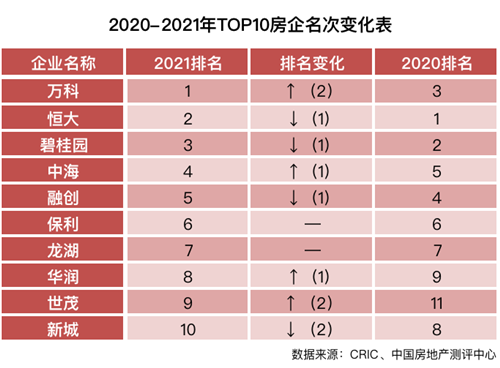 根據(jù)測評報告,2021中國房地產(chǎn)開發(fā)企業(yè)綜合實力TOP500前三位由萬科、恒大、碧桂園占據(jù)。其中,萬科上升兩位,綜合實力排名第一,恒大、碧桂園分列二、三。中海、融創(chuàng)、保利、龍湖、華潤、世茂、新城分列四至十位。與2020年相比,2021年TOP10變動率為10%,其中世茂為新晉企業(yè);TOP50的變動率約為10%,整體相對較為穩(wěn)定。