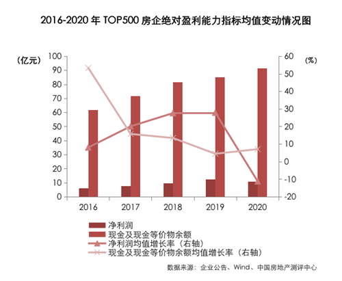 2020年,TOP500房地產(chǎn)開發(fā)企業(yè)總資產(chǎn)收益率均值為1.32%,較上年下降了0.52個百分點;凈資產(chǎn)收益率均值為4.53%,較上年下降了4.16個百分點;成本費用利潤率均值為11.25%,較上年下降了6.75個百分點。利潤空間收窄,房企總資產(chǎn)逐年上漲,尤其近兩年房企的凈利潤增幅不及資產(chǎn)增幅,導(dǎo)致總資產(chǎn)收益率下滑。