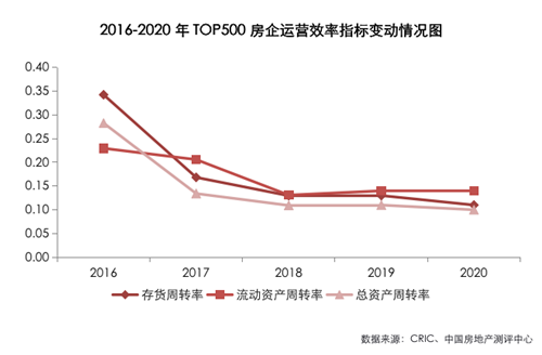 2020年TOP500房地產(chǎn)開發(fā)企業(yè)存貨周轉(zhuǎn)率均值為0.11,較2019年降低0.02;整體流動資產(chǎn)周轉(zhuǎn)率均值為0.14,與2019年持平;總資產(chǎn)周轉(zhuǎn)率均值為0.10,較2019年降低0.01。從三大運營指標(biāo)看,總體數(shù)據(jù)依然處于低位。