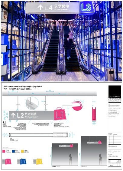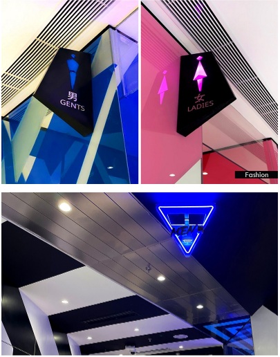 導(dǎo)視吊牌除了以購物袋造形和區(qū)域顏色的樓層號來提醒訪客他們所在位置外,graphia革思亞的另一創(chuàng)作是在洗手間和電梯前廳,把不同形狀和不同角度的大型扁平燈箱貼掛在天花板上,來吸引訪客對這些重要設(shè)施位罝的注意。設(shè)計不但豐富了商場的環(huán)境,更是非常實用。