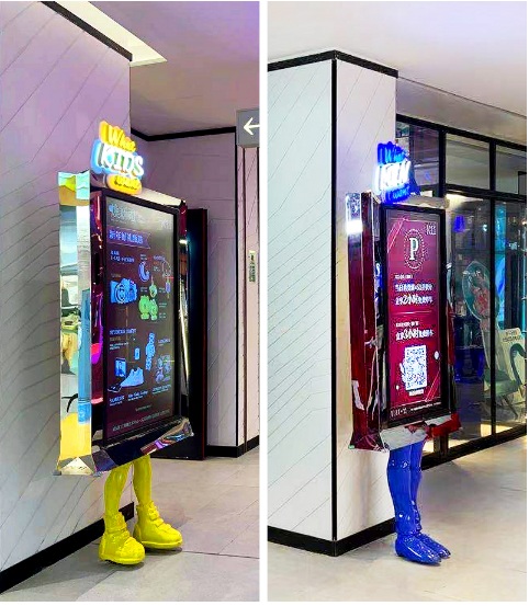 以具有科技感的鏡面不銹鋼制作成大型購物袋造型的觸屏互動指南及廣告燈箱,搭配了不同空間專屬顏色的機器人手和腳:粉色是購物總指南,藍色是藝術(shù)裝置指南,黃色則是餐飲指南。另外還有針對這三組客群的專屬購物廣告機器人,它們就像是帶領(lǐng)著訪客認識K11每一個角落的親善大使。