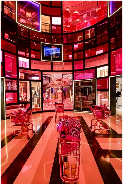 從半戶外式的門廊到室內(nèi),K11有很多大型特色墻和裝置,它們大多以多角度的鏡面配LED霓虹裝飾,制造出夸張、刺激、富有未來感的室內(nèi)空間,形成和戶外一個很強烈的對比。這不但增強了品牌的年輕感和未來感,同時也讓商場充滿驚奇感。在室內(nèi),graphia革思亞引入了其他超現(xiàn)實主義和購物設(shè)計元素來配合整體氛圍,增加訪客的購物欲——這也帶出了此K11商場的內(nèi)裝主題:Shopaholic購物狂。
