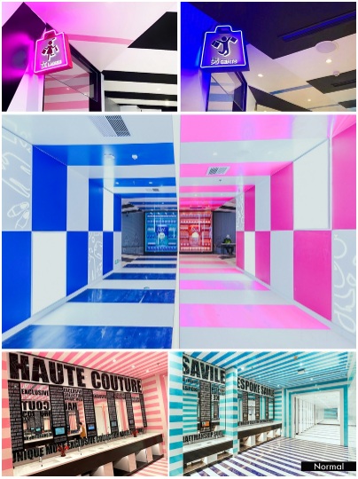 進入商場后,Shopaholic World購物狂的世界如同夢境般,是一個離奇的和充滿未來感的空間。每層的扶手電梯仿佛是條跨越時空的隧道,被三面布滿霓虹裝飾和發(fā)光標(biāo)志的藝術(shù)鏡墻包圍著,傳統(tǒng)的導(dǎo)向箭頭以活潑夸張的霓虹圖案手法來演譯,在不同立面、不同角度引領(lǐng)著訪客去探索K11這個地方。