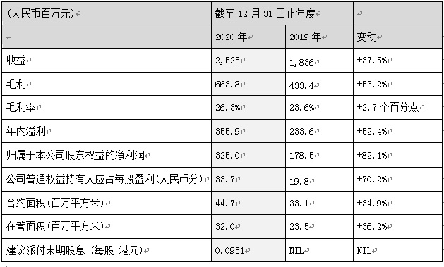 2020年,卓越商企服務經(jīng)營業(yè)績實現(xiàn)了高速增長,總收入達約人民幣25.3億元,較上年增長37.5%,毛利潤為人民幣6.64億元,同比大幅增長53.2%,歸屬于母公司股東權(quán)益的凈利潤為人民幣3.25億元,同比增加82.1%。建議派付末期股息每股0.0951港元。
