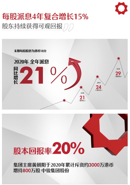 盈利能力持續(xù)增強的同時,集團也十分注重股東利益。公司2020年末期股息每股港幣18分;全年股息每股港幣29分,上升21%;股本回報率達20%。過去4年,集團每股全年派息復合年均增長達15%。