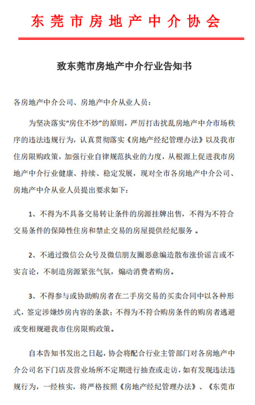 《告知書》提出,東莞房地產(chǎn)中介不得為不具備交易轉讓條件的房源掛牌出售,不得為不符合交易條件的保障性住房和禁止交易的房屋提供經(jīng)紀服務;不得通過微信公眾號及微信朋友圈惡意編造散布漲價謠言或不實言論,不得制造房源緊張氣氛,煽動消費者購房;不得參與或協(xié)助購房者在二手房交易的買賣合同中以各種形式,簽定涉嫌炒房內容的條款;不得為不符合購房條件的購房者逃避或變相規(guī)避東莞住房限購政策等內容。