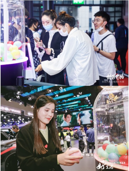 好生活×合創(chuàng)展位不僅有當(dāng)前最火的新能源汽車,還有一個(gè)可領(lǐng)福利的扭蛋機(jī),“遭到了”觀眾圍觀,大家都希望能成為當(dāng)天的錦鯉。看展之余,還能參與活動(dòng)抽取超值福袋禮包。禮包的獎(jiǎng)品也是非常的豐富,有EDG定制禮品、貓王音響、小度音響、手機(jī)支架等眾多禮品,掃碼即可參與抽獎(jiǎng),誰(shuí)是今天的幸運(yùn)錦鯉?