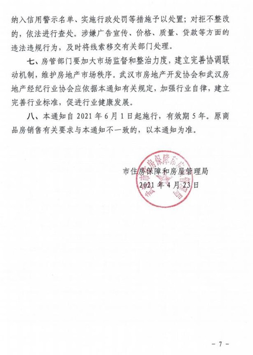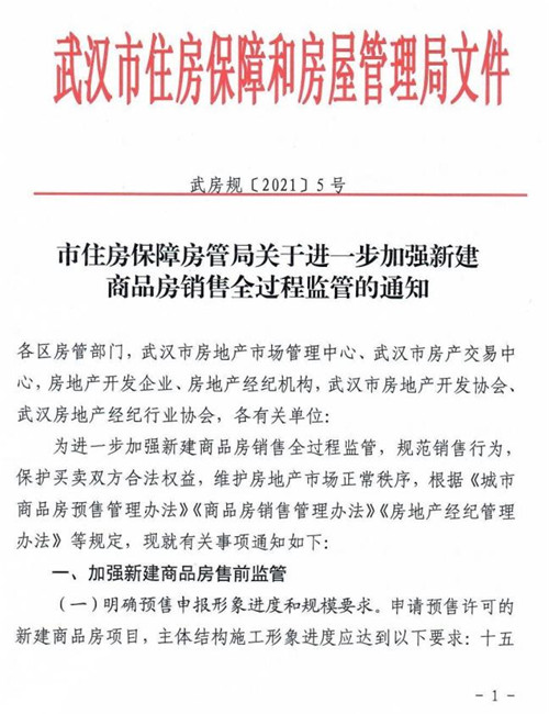 房訊網(wǎng)訊 4月27日,武漢市住房保障和房屋管理局發(fā)布《關(guān)于進(jìn)一步加強(qiáng)新建商品房銷售全過程監(jiān)管的通知》,通過完善和加強(qiáng)新建商品房銷售全過程監(jiān)管制度措施,進(jìn)一步規(guī)范市場主體經(jīng)營行為,激發(fā)市場主體活力,維護(hù)市場良好秩序,促進(jìn)房地產(chǎn)市場平穩(wěn)健康發(fā)展。