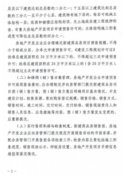 《通知》明確商品房預(yù)售條件。原則上新建商品房項(xiàng)目主體結(jié)構(gòu)施工形象進(jìn)度十五層及以下建筑達(dá)到1/2,十五層以上建筑達(dá)到1/3且不少于七層可申報(bào)商品房預(yù)售許可;申報(bào)規(guī)模根據(jù)《建設(shè)工程規(guī)劃許可證》批準(zhǔn)總建筑面積可分次申報(bào),20萬平方米以下的不超過3次,20萬平方米及以上的不超過5次。