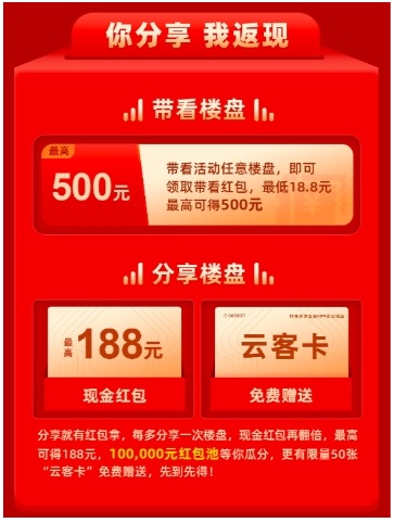 據(jù)活動負(fù)責(zé)人介紹:“帶看、分享樓盤是經(jīng)紀(jì)人成交的關(guān)鍵指標(biāo),在這些環(huán)節(jié)設(shè)置獎勵,可以有效激勵商戶的活躍度,幫助經(jīng)紀(jì)人獲得更多成交機會!被顒悠陂g,經(jīng)紀(jì)人進入多多賣房APP活動詳情頁,可以瀏覽所有參與活動的樓盤,分享樓盤即可領(lǐng)取最高188元現(xiàn)金紅包,帶看活動任意樓盤還可以獲得最高500元的現(xiàn)金紅包。