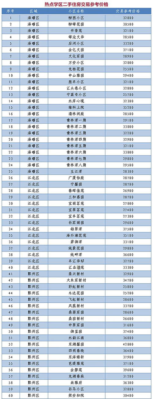 房訊網(wǎng)訊 5月10日,浙江省寧波市住建局發(fā)布消息,為貫徹落實《關(guān)于進一步加強房地產(chǎn)市場調(diào)控促進房地產(chǎn)市場平穩(wěn)健康發(fā)展的通知》(甬建發(fā)〔2021〕41號)相關(guān)要求,建立熱點學區(qū)二手住房交易參考價格發(fā)布機制,促進二手住房市場信息透明、理性交易,寧波市先行發(fā)布寧波市實驗小學、海曙外國語學校(青林灣校區(qū)、五江口校區(qū))、寧波大學附屬學校、華泰小學(東校區(qū)、西校區(qū))、堇山小學、宋詔橋小學、四眼小學(新河校區(qū))、鎮(zhèn)海區(qū)中心學校、鎮(zhèn)海應(yīng)行久外語實驗學校9個熱點學區(qū)范圍內(nèi),112個小區(qū)的二手住房交易參考價格。