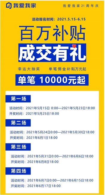 2021年5月15日,我愛我家21周年慶“百萬補貼 成交有禮”活動正式拉開序幕,此次活動覆蓋杭州、上海、南京、蘇州、天津、太原、無錫、鄭州、成都、武漢、常州、青島12個城市,針對具有二手房需求人群釋放百萬補貼,為廣大購房者提供貨真價實的福利。